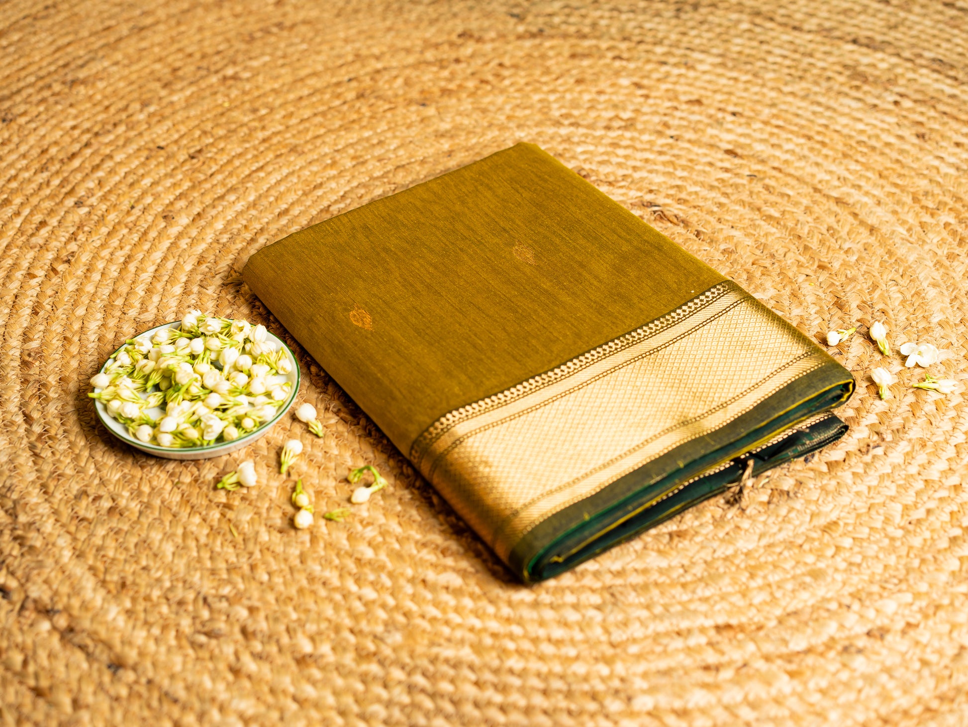Traditional Maheshwari Paithani Border with all over Swastika Zari Butti Weaving Sarees Olive Green & Bottle Green